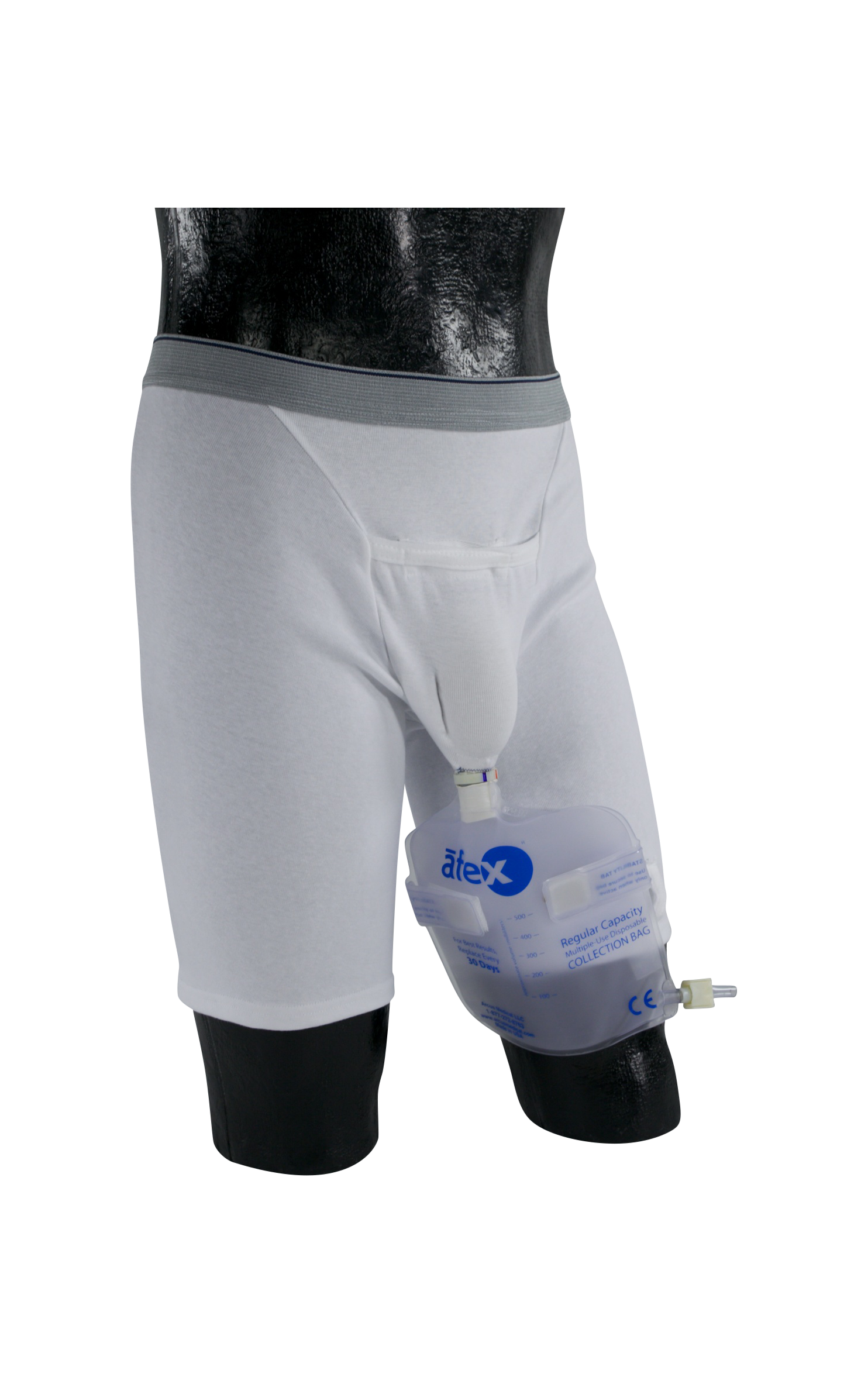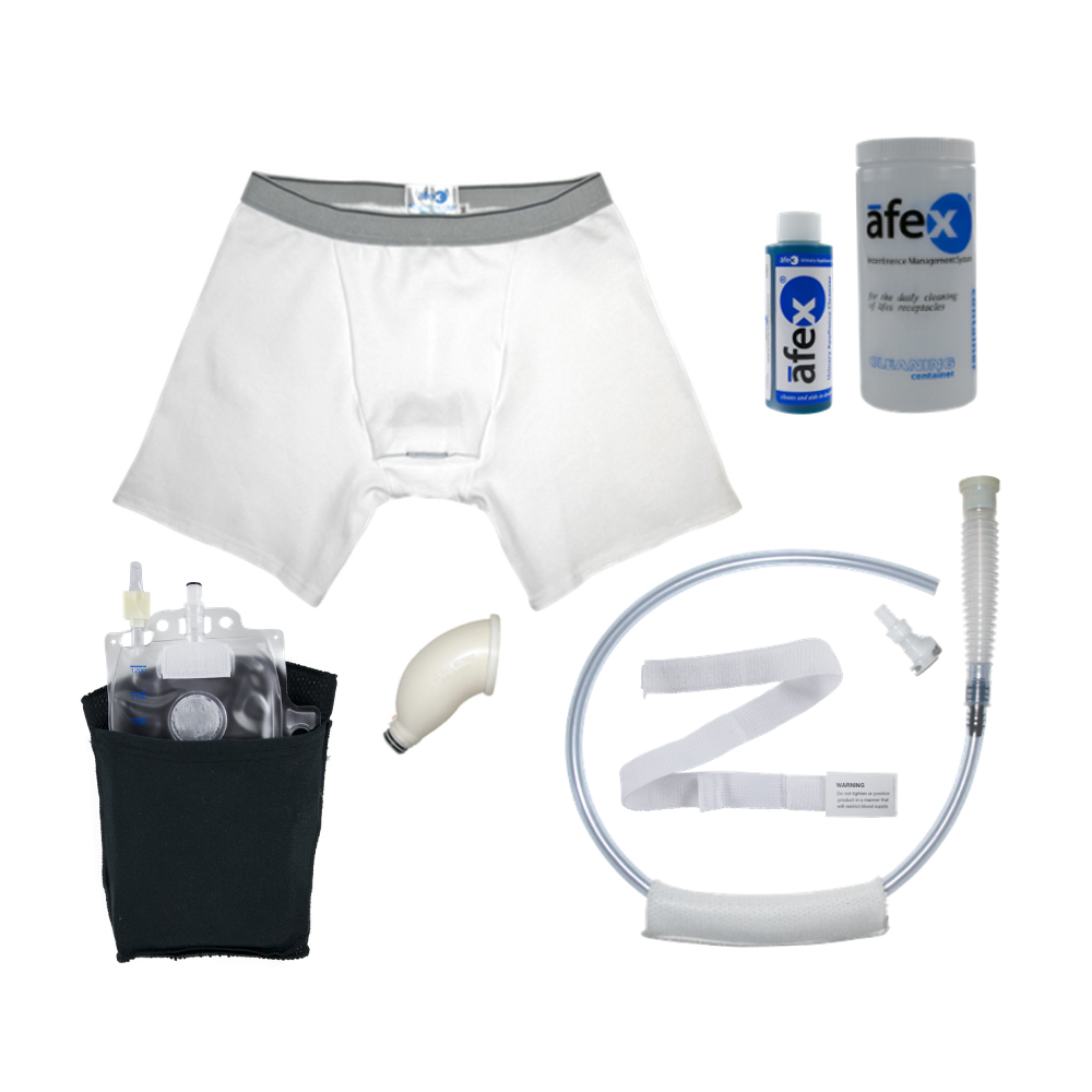The āfex system makes managing chronic male incontinence easier than ever. The 96% cotton boxer-briefs discreetly and securely hold a plastic ergonomic curved receptacle inside a front pocket that channels urine into a 500ml reusable collection bag. No tubes or straps are required - just attach the bag directly to the receptacle through the briefs for hours of use without maintenance or changing.