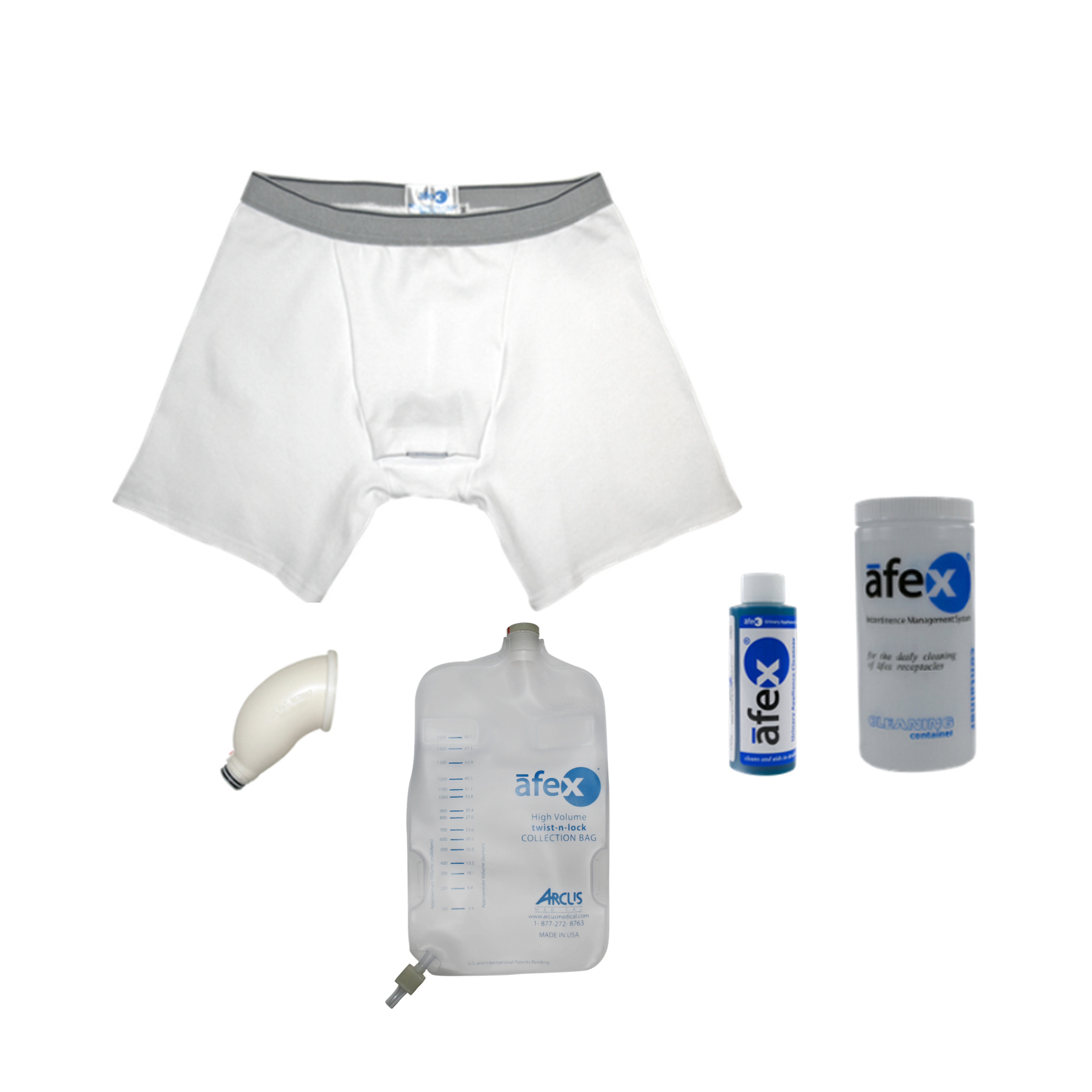 The āfex system makes managing chronic male incontinence easier than ever. The 96% cotton boxer-briefs discreetly and securely hold a plastic ergonomic curved receptacle inside a front pocket that channels urine into a 500ml reusable collection bag. No tubes or straps are required - just attach the bag directly to the receptacle through the briefs for hours of use without maintenance or changing.